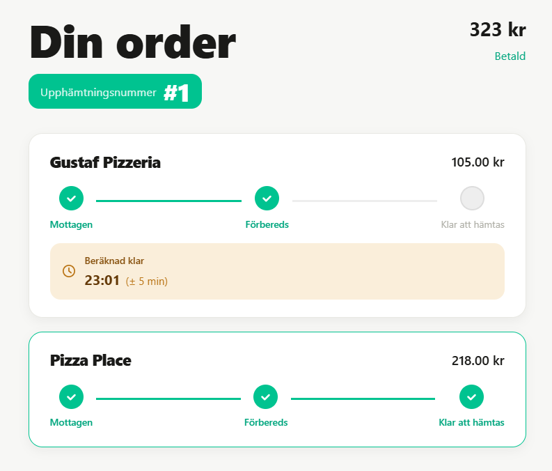 Följ statusen för varje rätt i realtid – från beställd till klar. Gästen behöver inte stå vid disken och vänta.